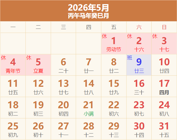 放假:5月1日 ~ 5日(周五 ~ 周二)