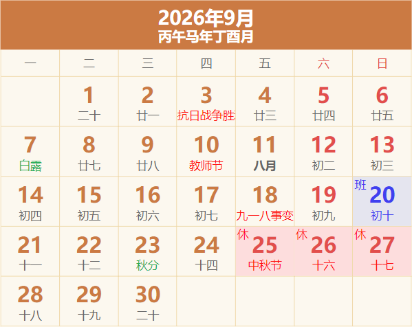 补班:9月20日(周六)、10月10日(周六)