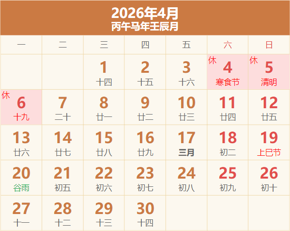 放假:4月4日 ~ 6日(周六 ~ 周一),注:4月5日是清明。